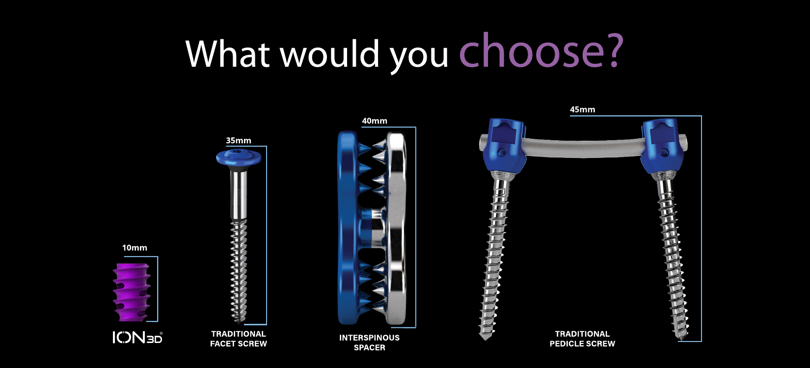 Using micro implants smaller than a dime to treat painful regions of the spine, ION 3D is 30mm-40mm smaller than traditional pedicle screws. The implant transfixes through the facet joint to stabilize the spine.