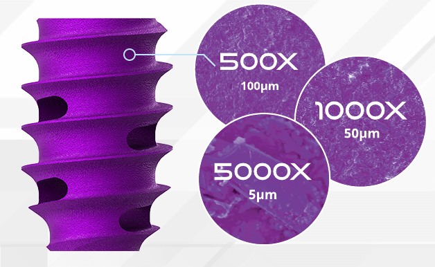 The hydrophilic surface created by Nanotex® technology takes advantage of ionic bonds to attract and hold blood, BMA, and other fluids that may contain key growth factors necessary for osseointegration